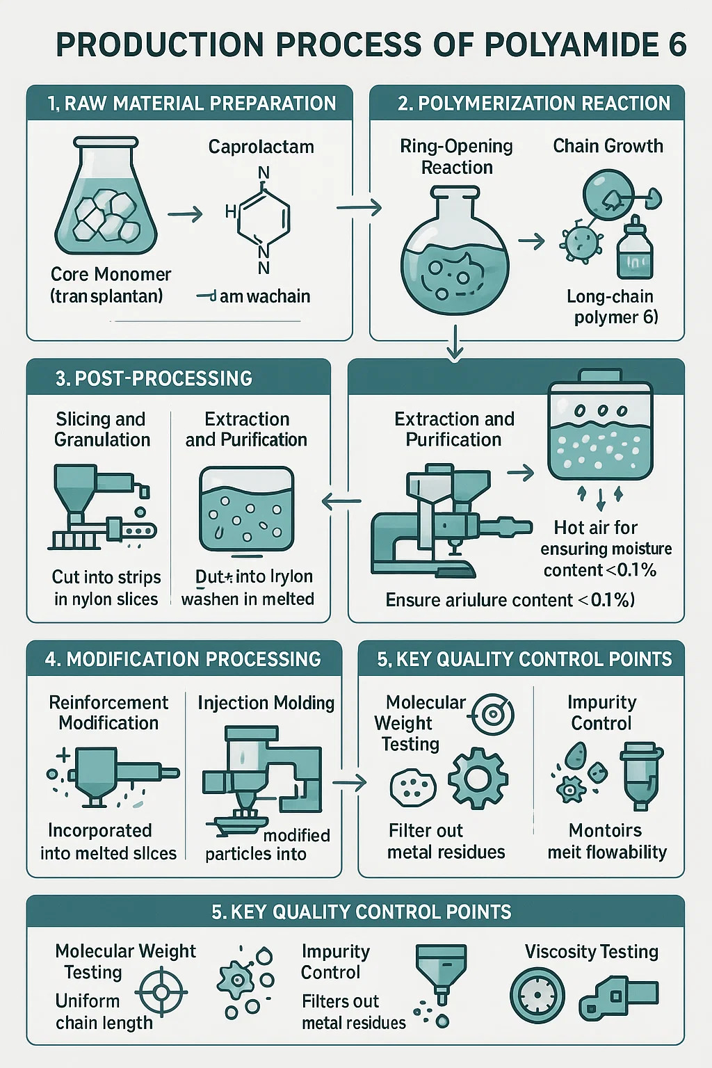 Kernmonomeer: Caprolactam (een transparant kristal), geproduceerd uit benzeen dat via een meerstapsreactie uit aardolie wordt geëxtraheerd.