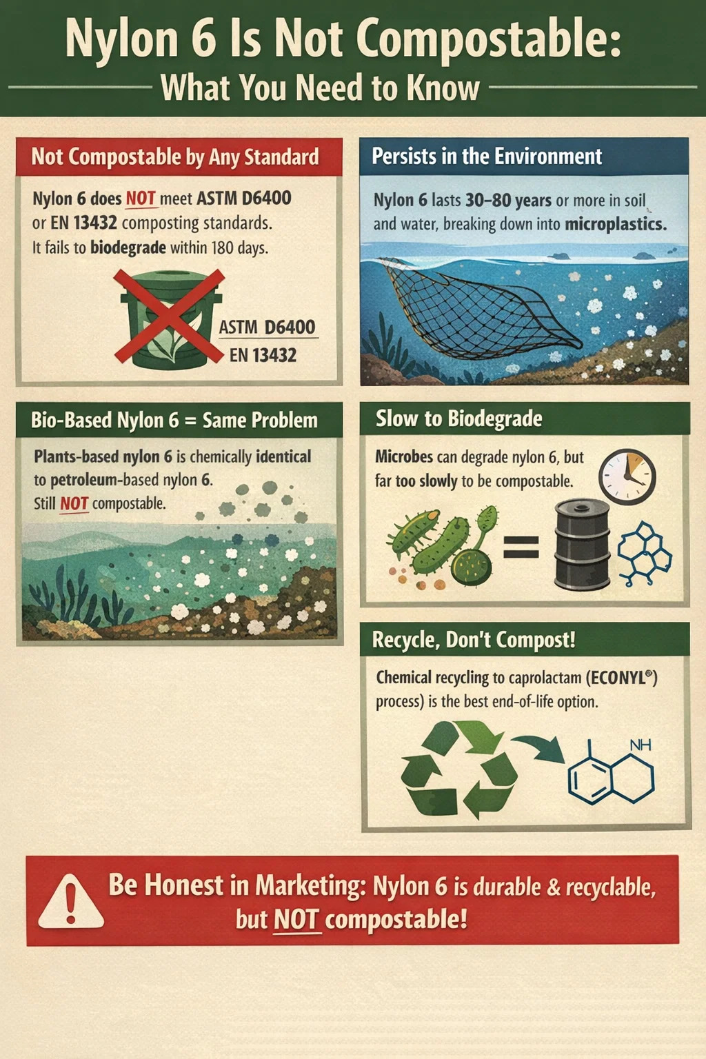 - Etiketteer producten die nylon 6 bevatten niet als composteerbaar, biologisch afbreekbaar of "teruggegeven aan de natuur" - dit is onnauwkeurig en vormt in veel markten een overtreding van de regelgeving onder de wetgeving inzake groene claims.