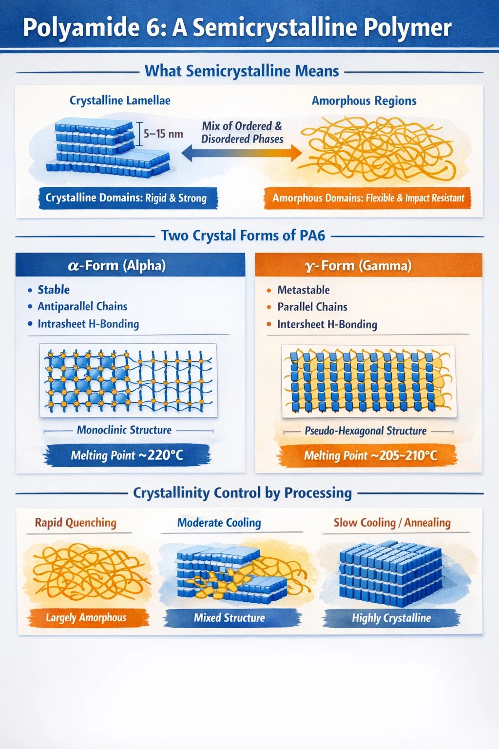 Polyamide 6 kristalliseert niet in één enkele unieke kristalstructuur. Het vertoont kristallijn polymorfisme, wat betekent dat het verschillende kristalstructuren kan vormen – polymorfen genoemd – afhankelijk van hoe het wordt verwerkt. De twee primaire polymorfen zijn de alfa (α) vorm en de gamma (γ) vorm, elk met verschillende atomaire arrangementen en mechanische gevolgen.