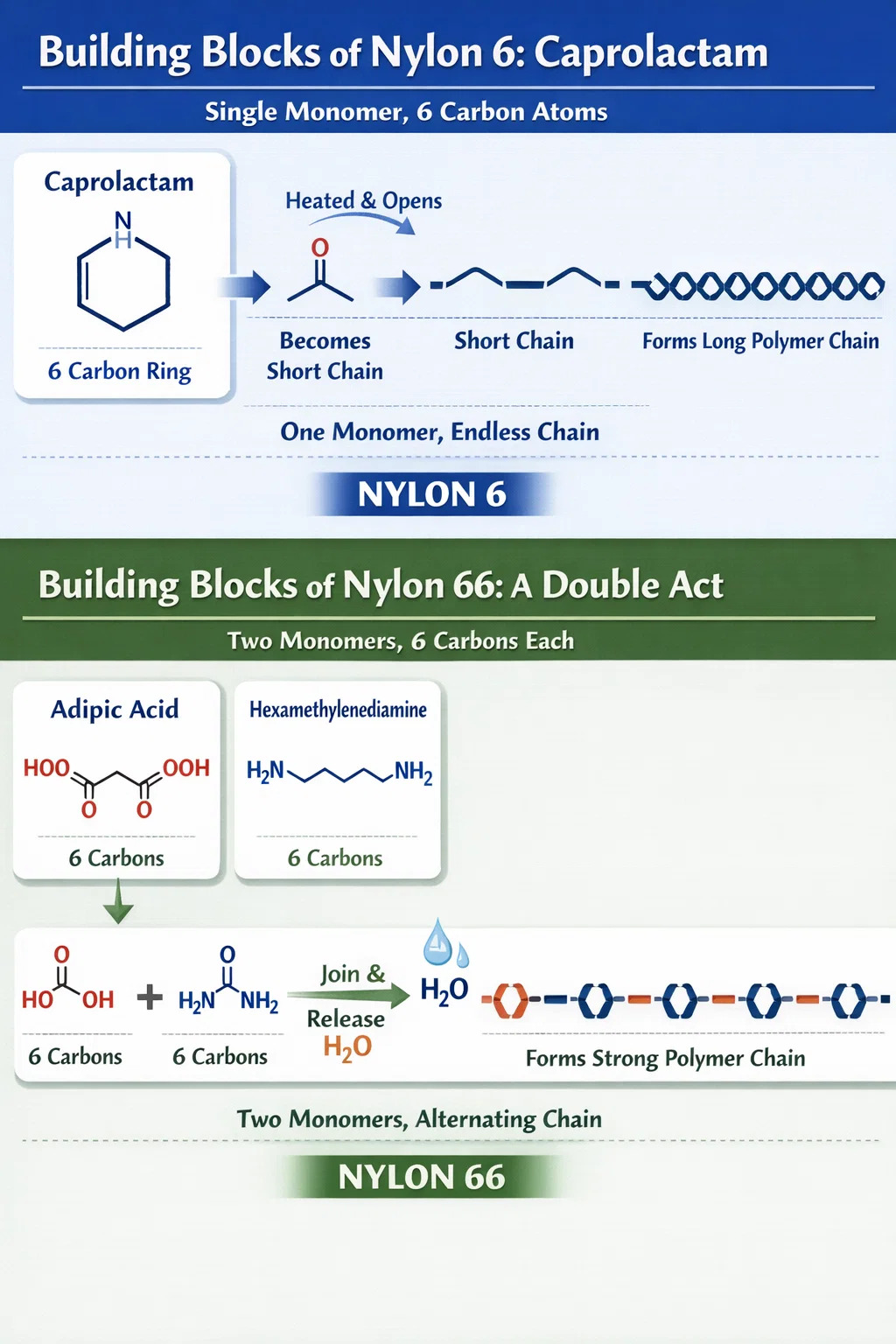 De naam Nylon bevat eigenlijk het geheim van de grondstoffen. De zogenaamde ‘monomeren’ zijn de basisbouwstenen die worden gebruikt om deze lange plastic ketens te creëren.