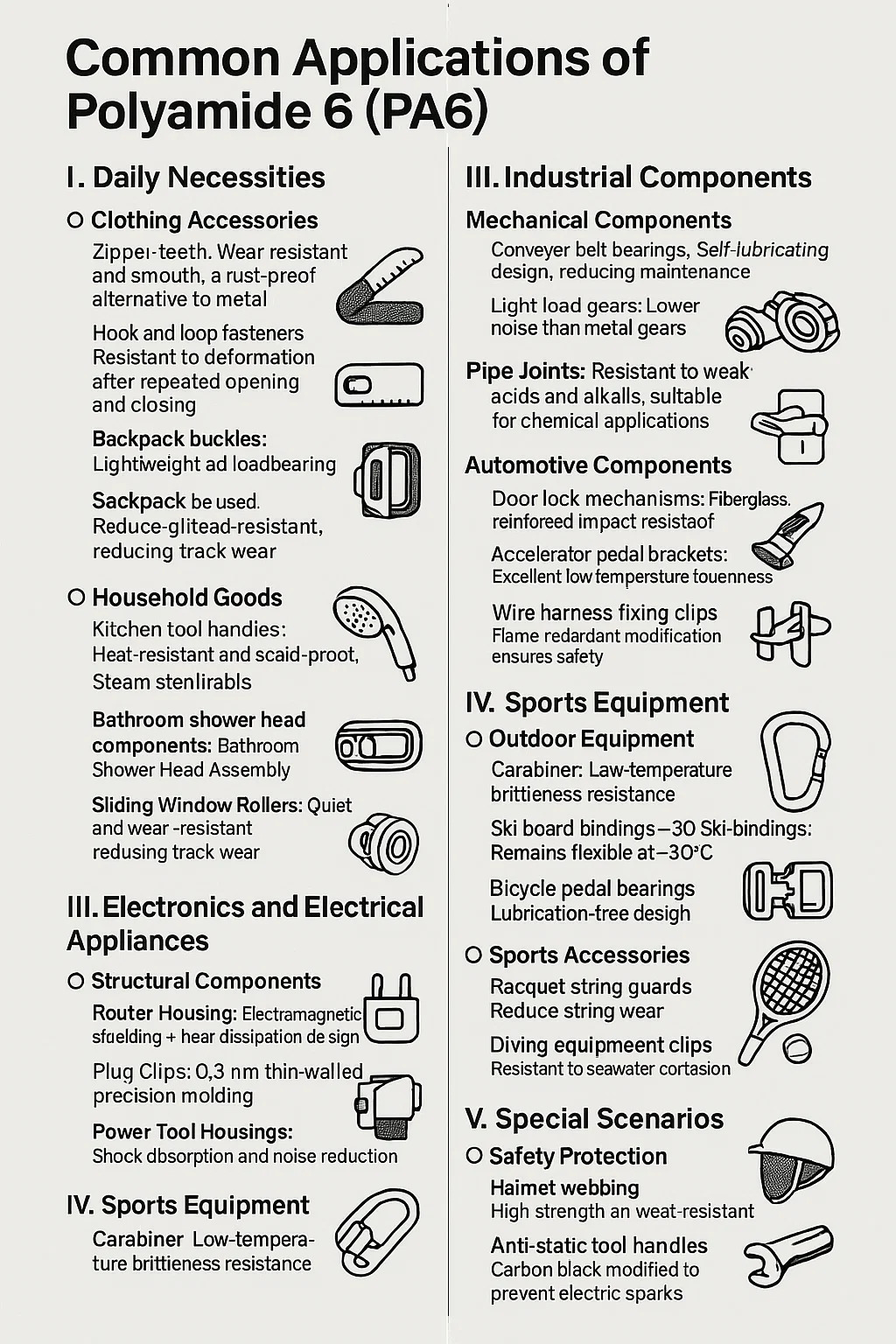 Het volgende is een inleiding tot veelvoorkomende toepassingen van polyamide 6 (PA6):