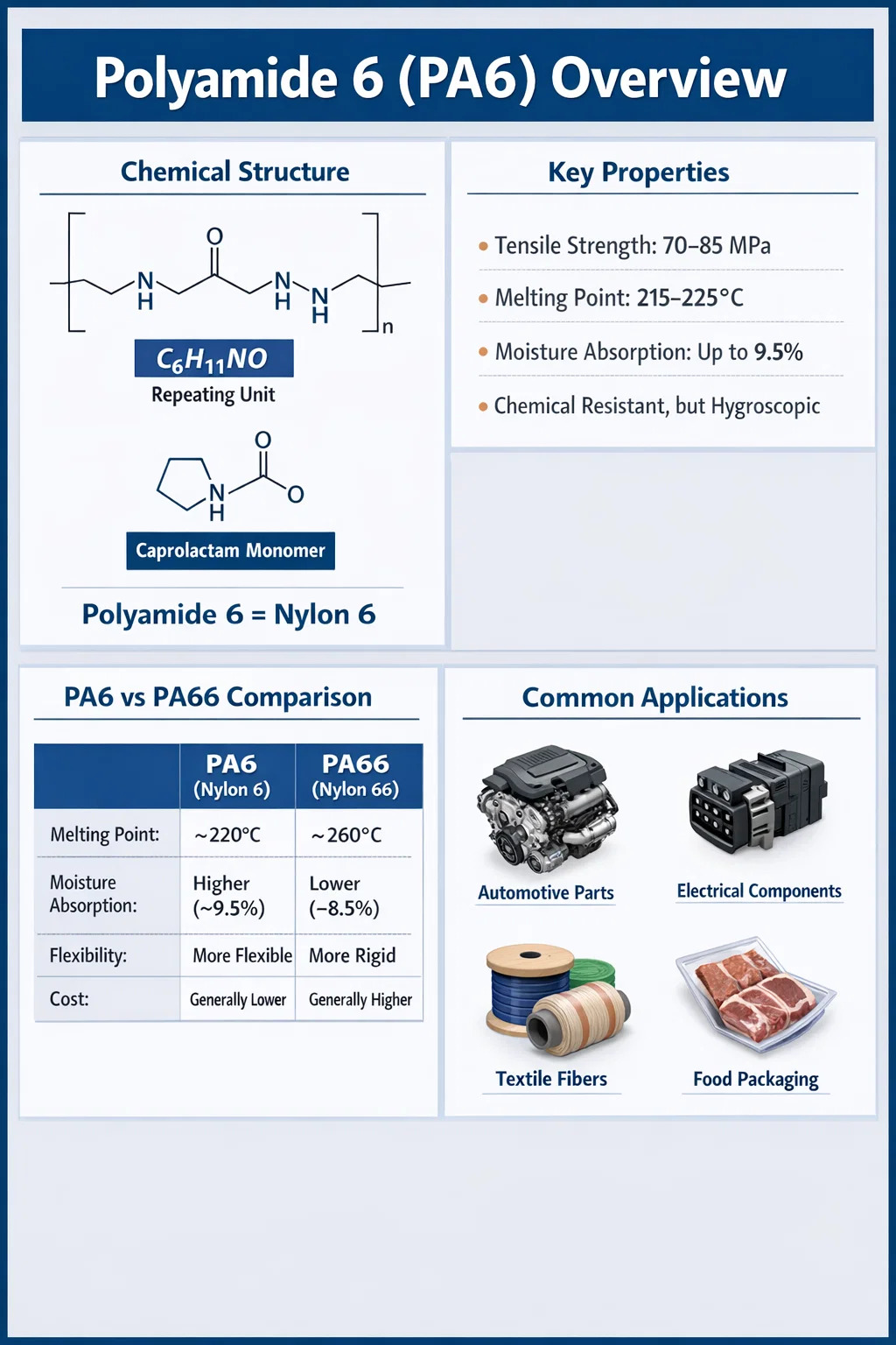 Polyamide 6 wordt gesynthetiseerd door de hydrolytische ringopeningspolymerisatie van ε-caprolactam, een cyclisch amide. Dit proces verschilt fundamenteel van Polyamide 66 (PA66), dat wordt gemaakt door condensatiepolymerisatie van twee afzonderlijke monomeren: hexamethyleendiamine en adipinezuur. De oorsprong van één monomeer van PA6 geeft het een uniformere en iets flexibelere ketenstructuur vergeleken met PA66.