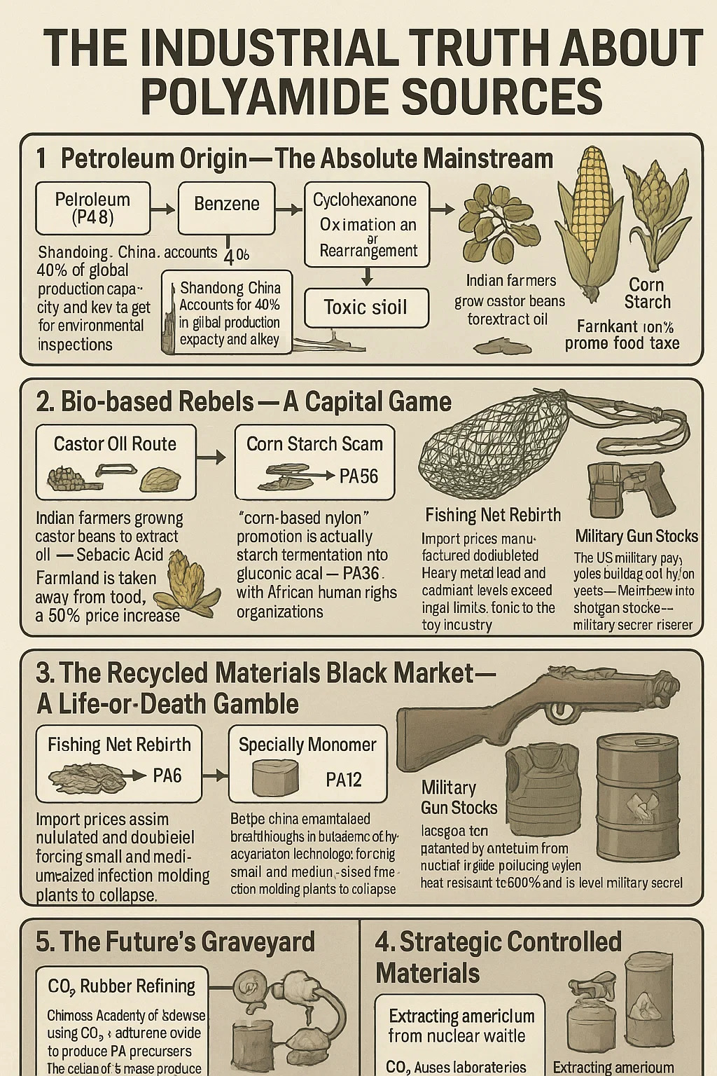 Caprolactam (PA6-voorloper): Aardolie → Benzeen → Cyclohexanon → Oximatie en herschikking, met ammoniumsulfaat als bijproduct en giftige grond. Shandong, China, is goed voor 40% van de mondiale productiecapaciteit en is een belangrijk doelwit voor milieu-inspecties.